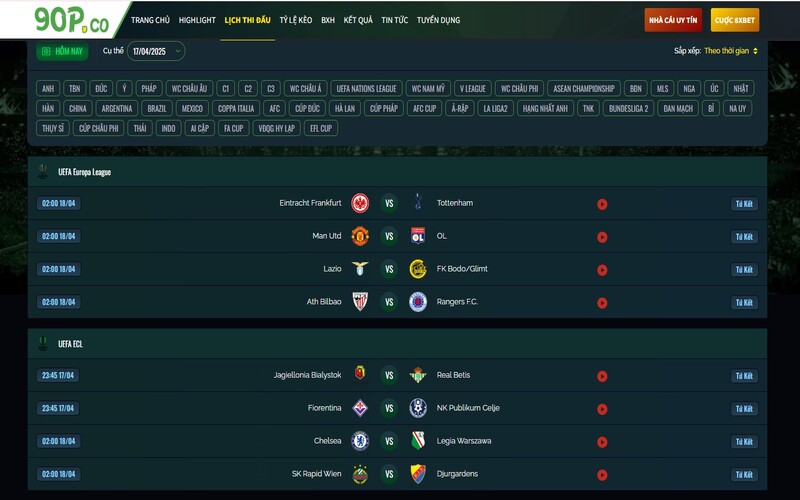 90 Phút TV luôn cập nhật các trận đấu mới nhất từ các giải đấu trên toàn thế giới. Nếu bạn là một tín đồ nhiệt thành của bóng đá, bạn sẽ không phải lo lắng về việc bỏ lỡ bất kỳ trận đấu quan trọng nào. Trang web cung cấp lịch thi đấu chính xác và đầy đủ, giúp bạn dễ dàng theo dõi những trận đấu yêu thích.