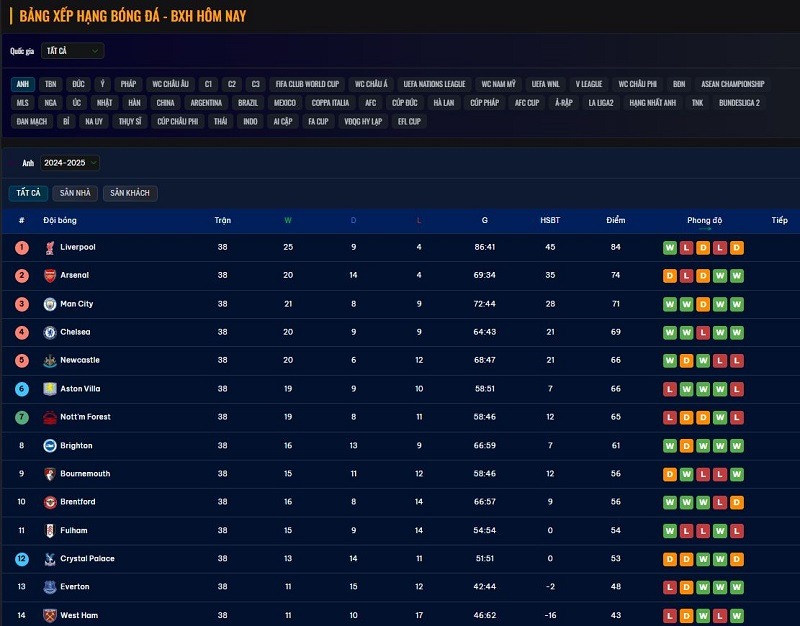 Giải Ngoại hạng Anh – Premier League, từ lâu đã trở thành một trong những giải đấu bóng đá lớn nhất hành tinh. Với sức hút mãnh liệt của những trận cầu đỉnh cao, không chỉ người hâm mộ mà cả giới chuyên gia, nhà cái cá cược đều cực kỳ quan tâm đến bảng xếp hạng – công cụ quan trọng để nắm bắt cục diện của giải đấu. Trong thời đại số, việc cập nhật bảng xếp hạng chính xác, nhanh chóng và đầy đủ thông tin là điều không thể thiếu. Và Ra Khoi TV, một trong những trang web bóng đá hàng đầu hiện nay, đã làm rất tốt vai trò này.