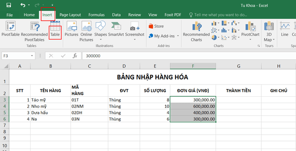 - Một ưu điểm tuyệt vời khác của việc chèn bảng vào Excel là bạn có thể sử dụng hàm này để tính toán toàn bộ một cột bằng cách nhập công thức vào một ô duy nhất.