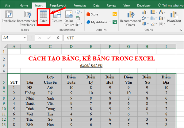 - Nếu bạn đang làm việc từ bàn phím thay vì sử dụng chuột, cách nhanh nhất để tạo bảng là nhấn ctrl T trên phím tắt để tạo bảng trong Excel.